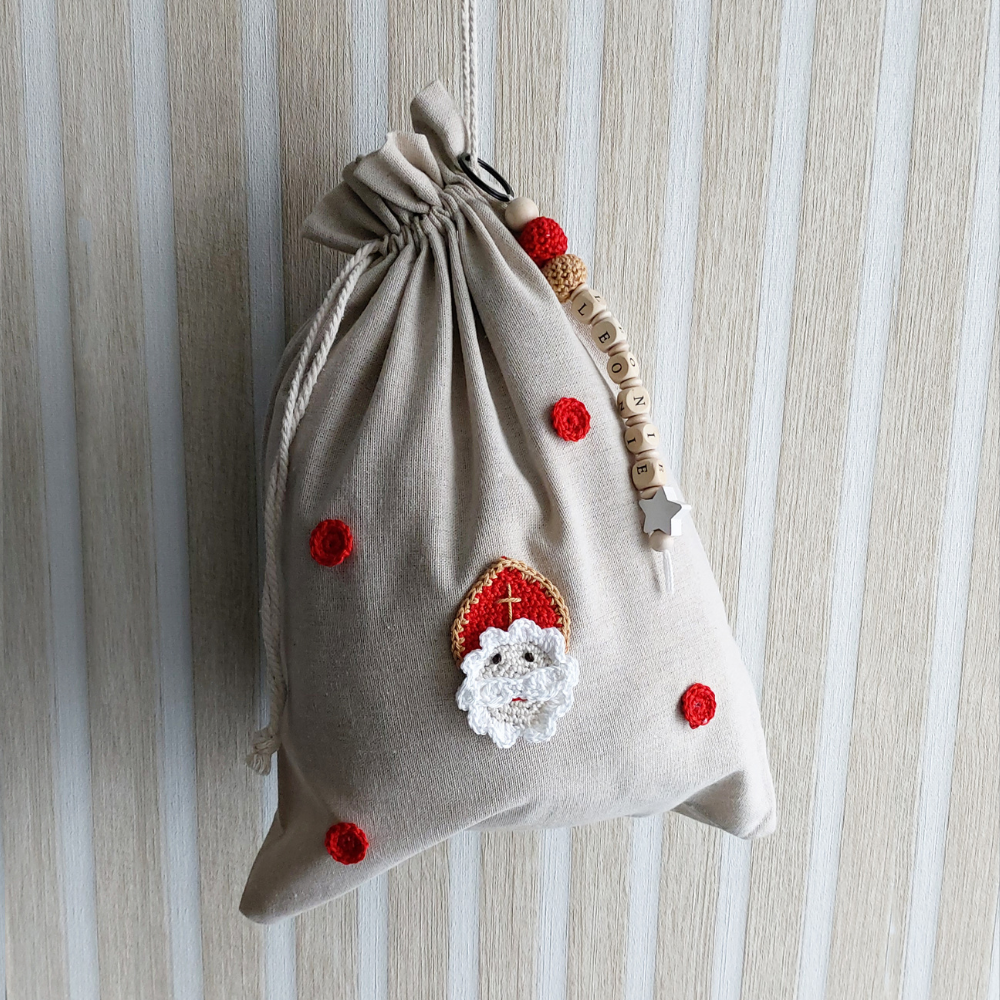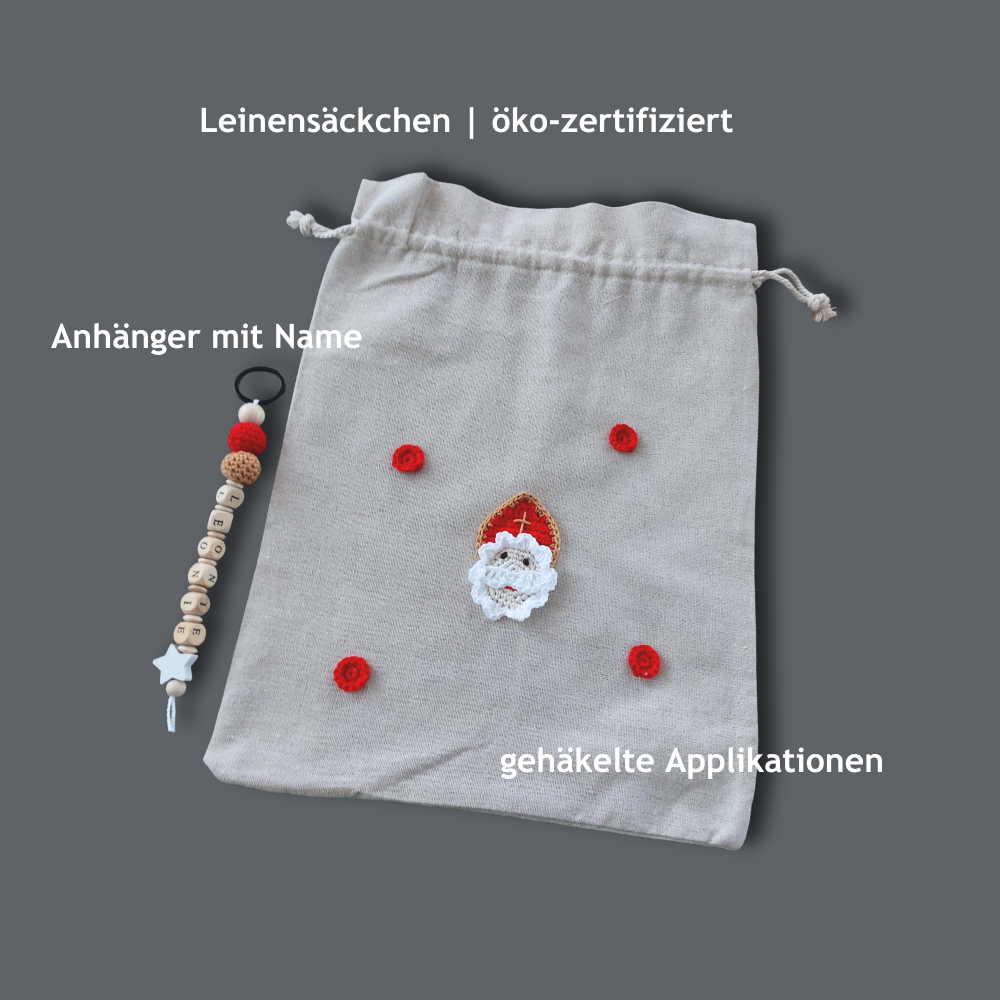 Das Nikolaussäckchen aus hochwertigen Materialien wird mit einem Wunschnamen versehen und mit einem gehäkelten Bischof (Nikolaus) verziert. Gefüllt mit Süßigkeiten, kleinen Überraschungen oder besonderen Geschenken sorgt es garantiert für leuchtende Momente.