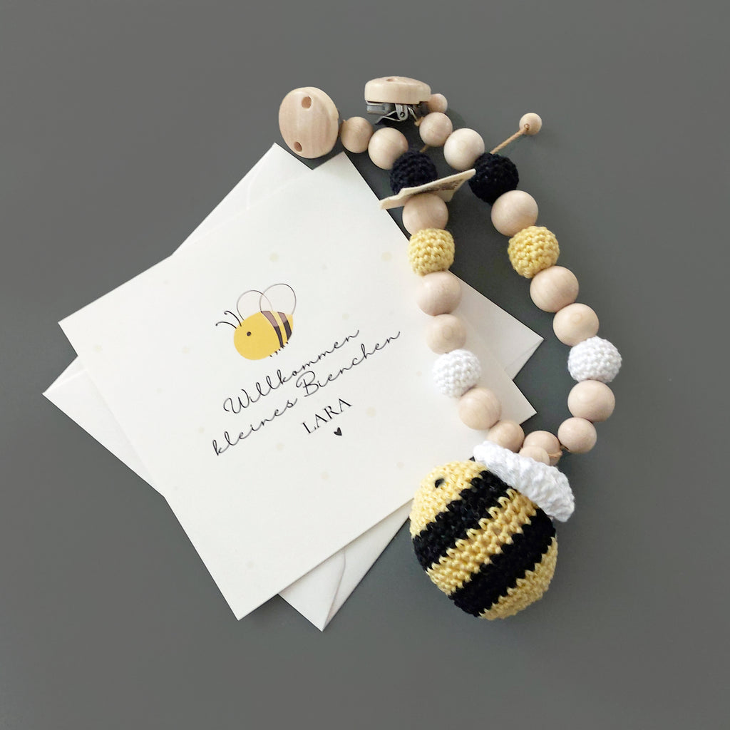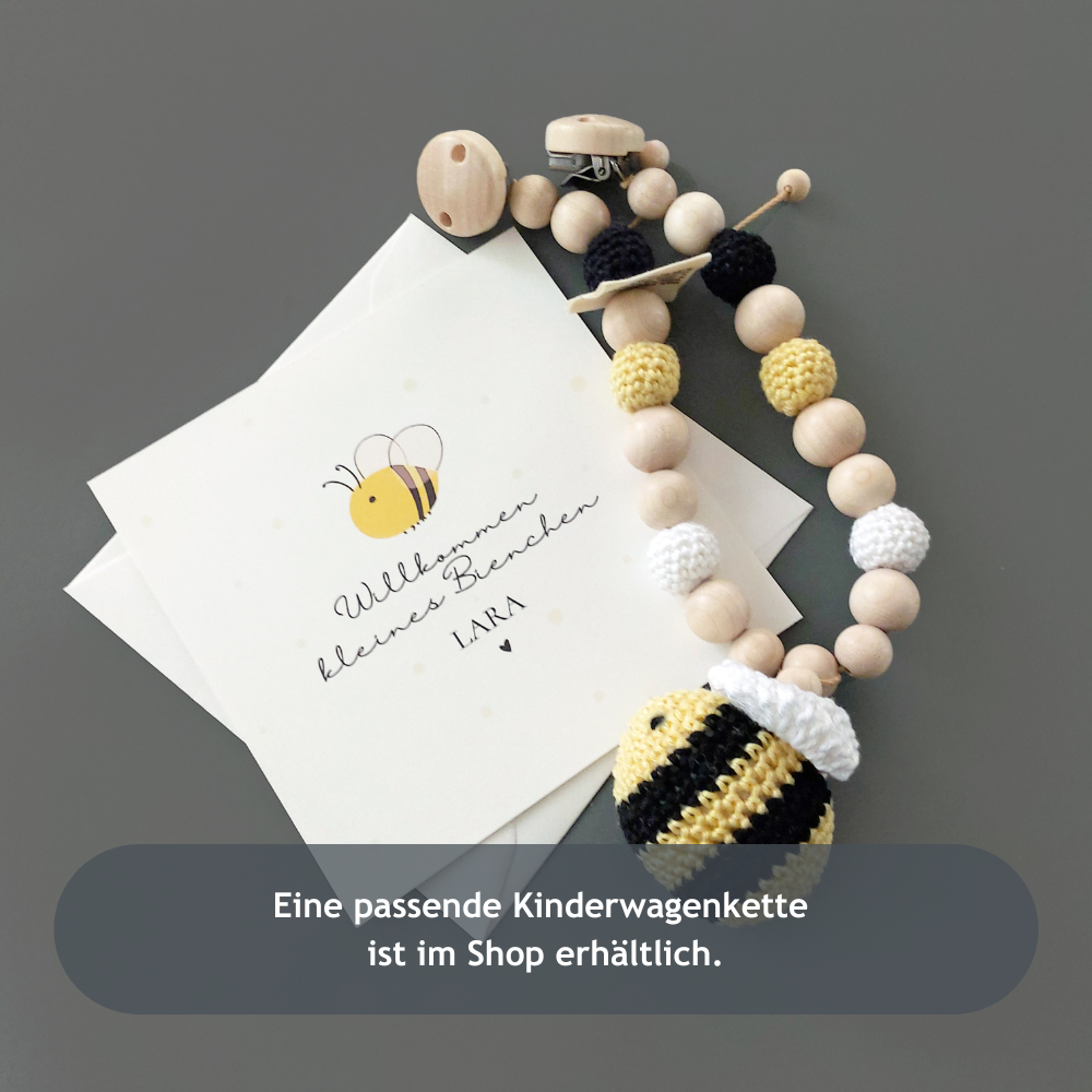 Eine passende Kinderwagenkette im gleichen Baby-Biene-Design ist ebenfalls im Shop erhältlich.