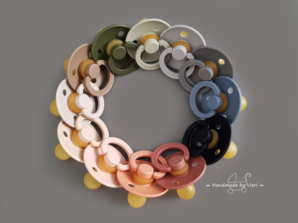 Diese Schnullerkette ist nur ein Beispiel. Auf Wunsch fertige ich sie auch in anderen Farben an. Es gibt eine große Auswahl. Den Silikonring oder den BIBs Schnuller kannst du gerne extra bestellen.
